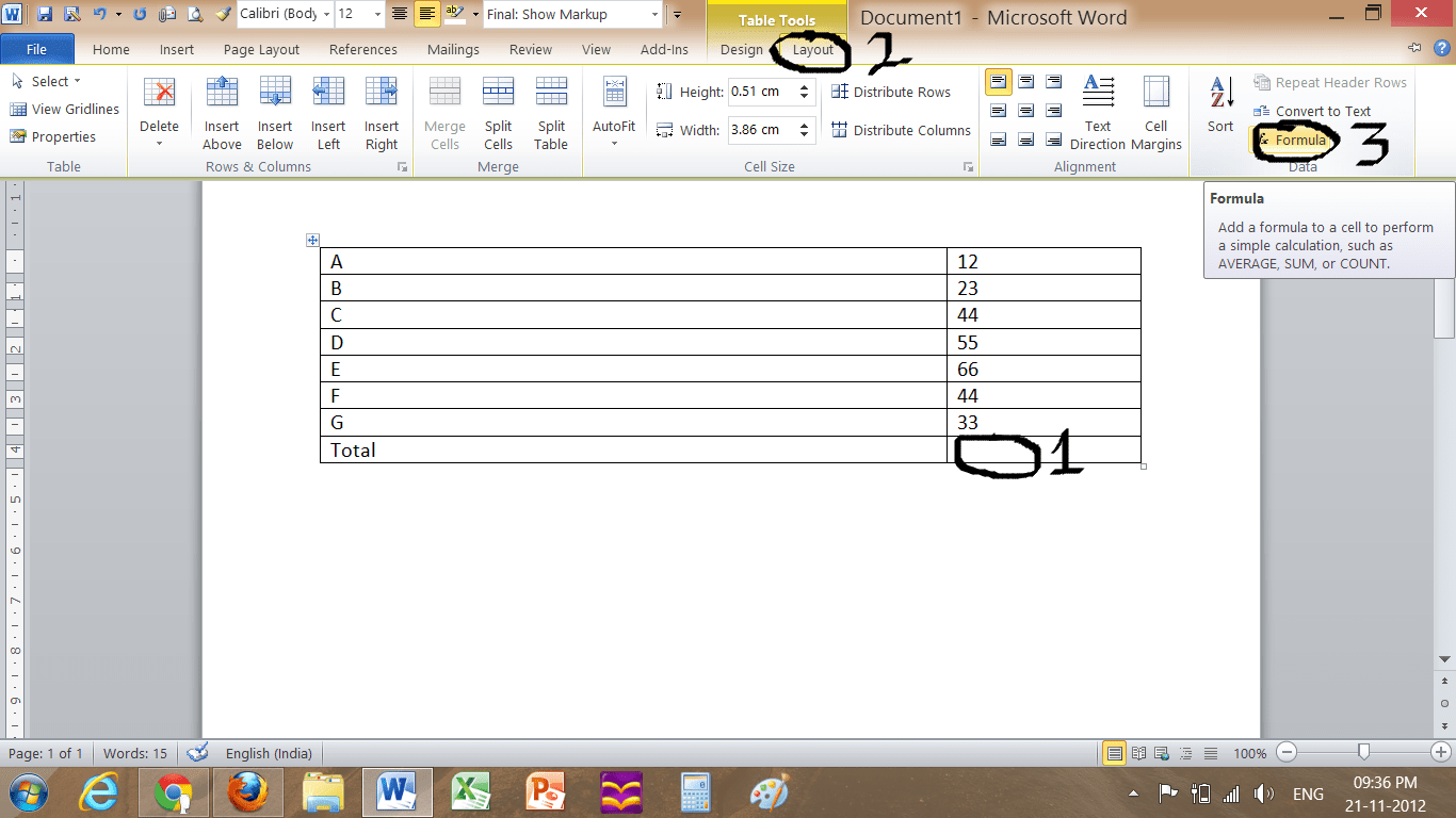 It is very useful while doing work in MS Word you can also do some small calculations , suppose you are preparing list of some objects with their price in a tabular form. At the end of table you also want to show their sum. You do some in MS word by adding summation formula from layout tab of word while you are in inside the table itself, see the screen shot below-